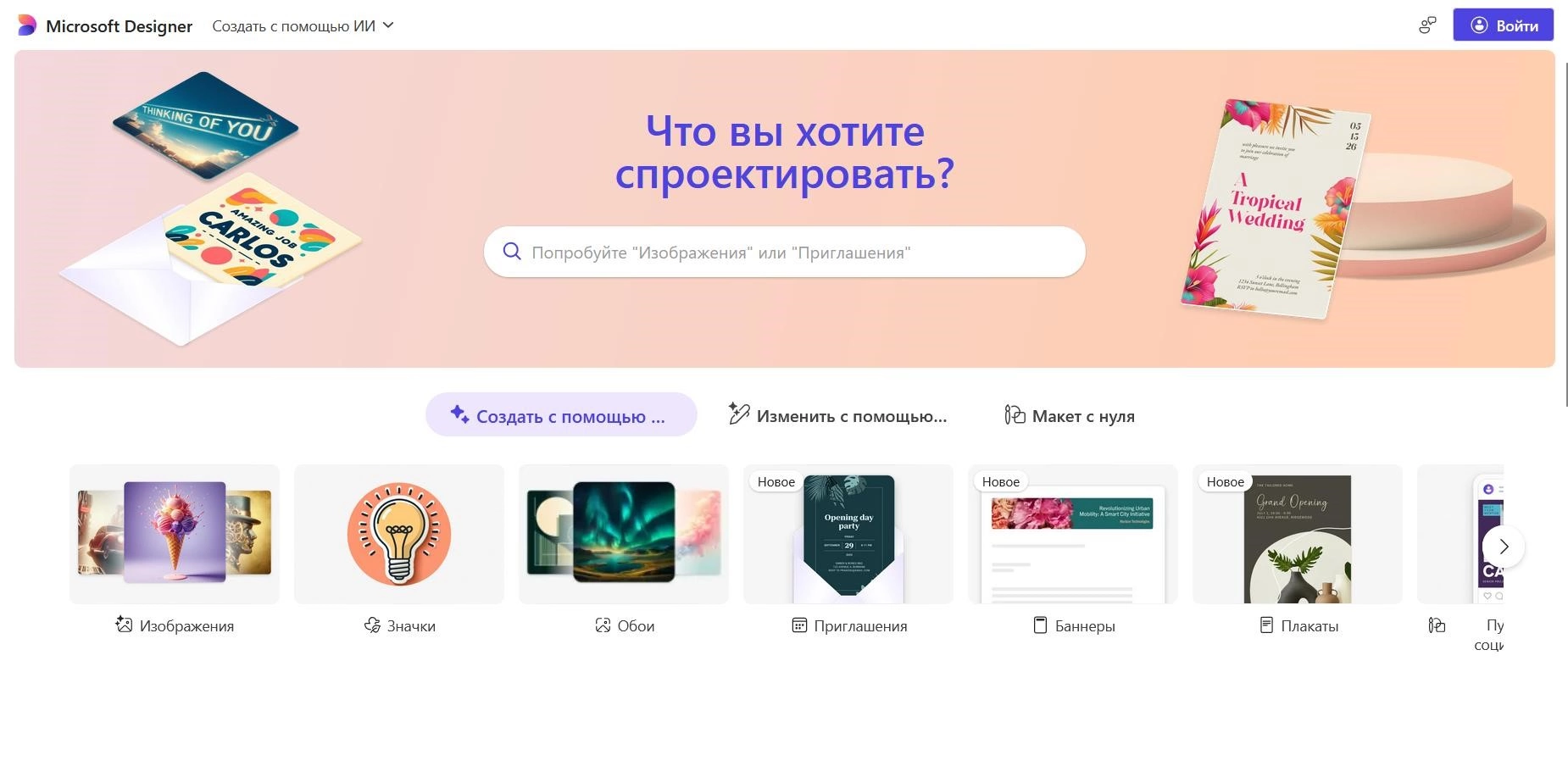 Microsoft Designer - облачный инструмент для графического дизайна с поддержкой генеративного ИИ. Сервис помогает за минуты собирать готовые макеты для соцсетей, открыток, приглашений, рекламных баннеров и иных задач, опираясь на текстовое описание и готовые шаблоны.