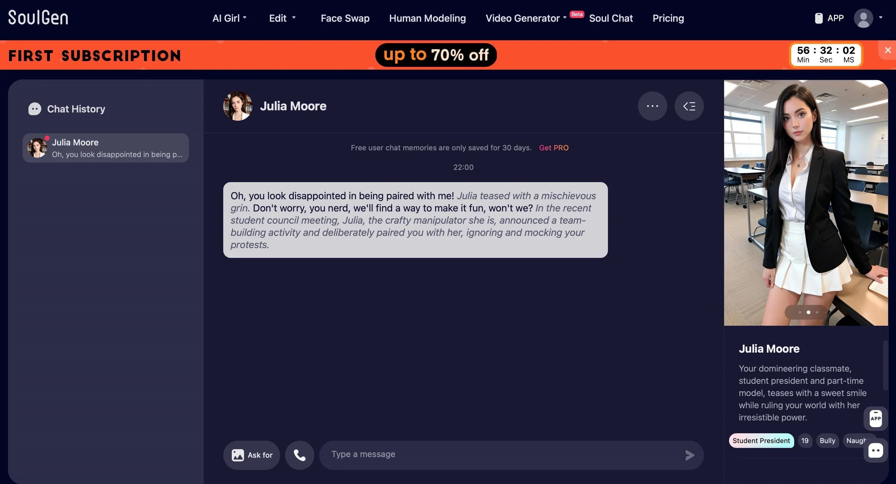 В SoulGen можно общаться с виртуальными персонажами. Пользователь создаёт или выбирает героя, задаёт ему характер и предпочтения, после чего открывается текстовый чат. Персонаж отвечает с опорой на описанную личность и историю, поддерживает диалоги и запоминает контекст.