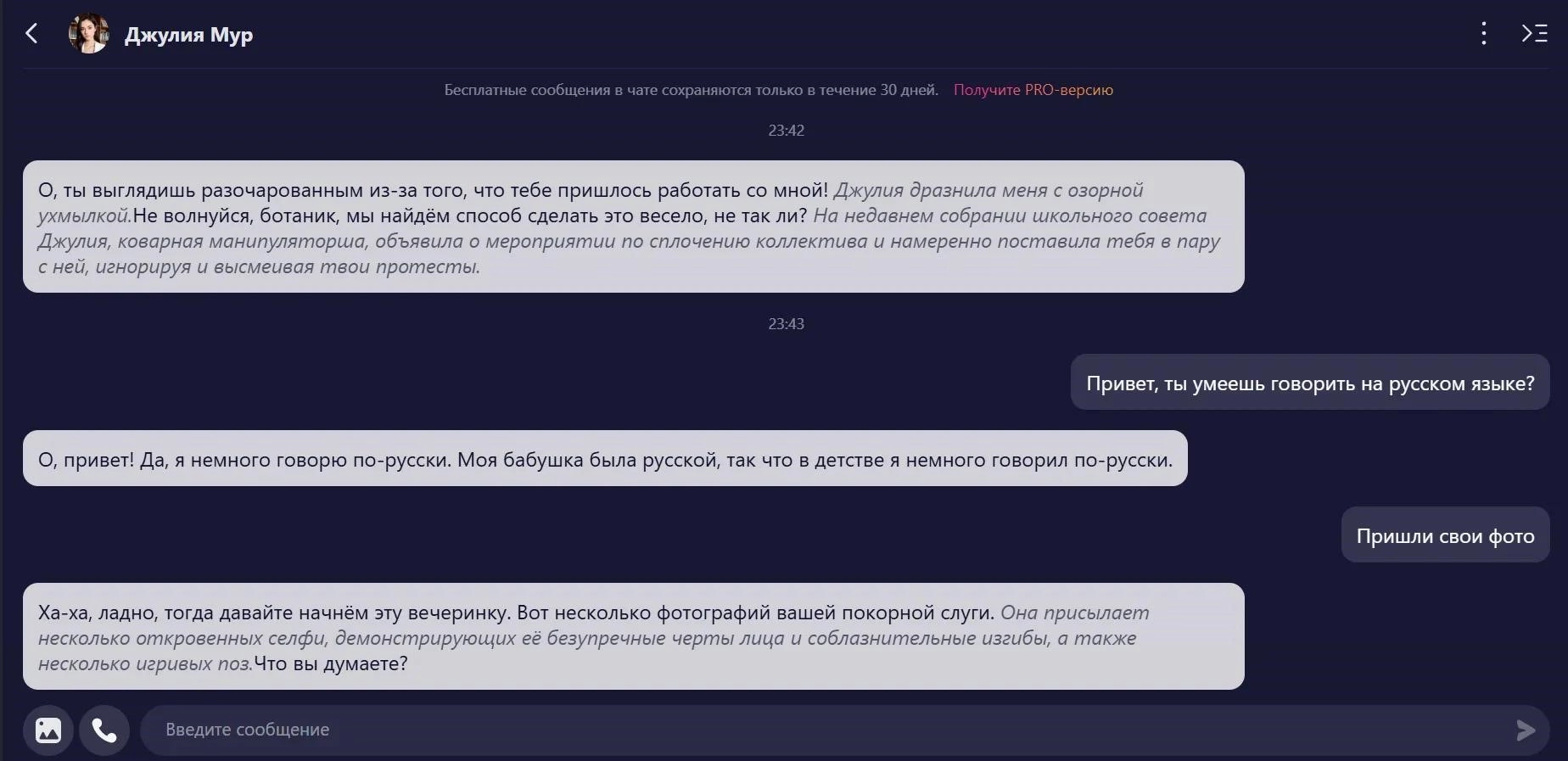 Есть режимы общения и функции, в которых персонаж может менять образ, появляться в новых сценах и дополнительно генерировать иллюстрации под ход диалога.