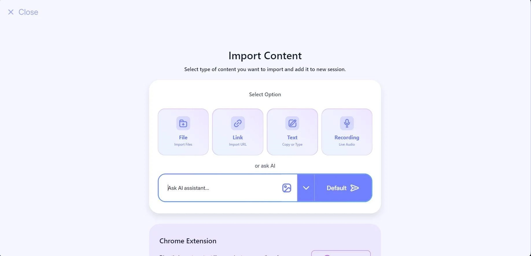 Чтобы начать работу, достаточно загрузить файл, вставить ссылку на страницу или видео. После обработки сервис открывает выбрать формат изучения. Конспект, сжатое резюме, набор карточек, тест или интерактивный диалог с ИИ тьютором по вашим данным.