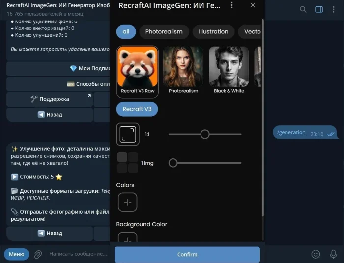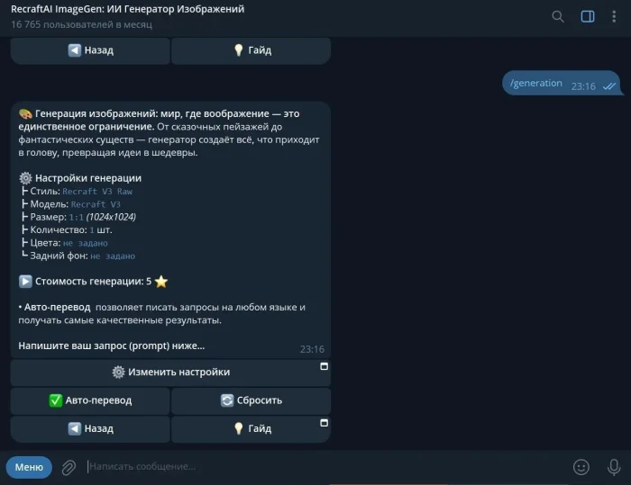 Пользователь переходит к боту через Telegram, подписывается на канал. Затем отправляет текстовое описание нужного изображения. Бот ставит запрос в очередь, передаёт его модели Recraft и через 30-60 секунд возвращает готовую картинку прямо в чат. Взаимодействие строится через команды и кнопки. Поэтому сервисом можно пользоваться с телефона без дополнительного софта.