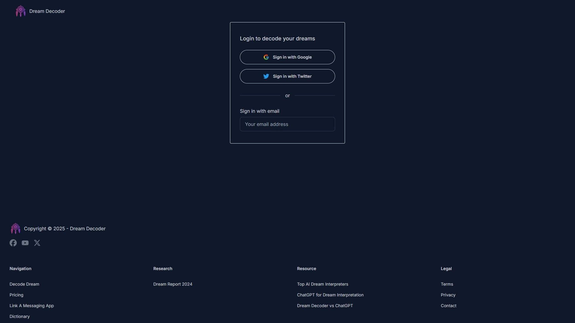 Dream Decoder - онлайн сервис для интерпретации сновидений с помощью искусственного интеллекта. Платформа использует модель GPT-4, анализирует текстовое описание сна и формирует развёрнутый ответ с возможными смыслами, эмоциональным фоном и скрытыми переживаниями. Общение построено в формате диалога: пользователь описывает сон. Нейросеть отвечает разъяснениями и мягкими рекомендациями для ежедневной жизни.