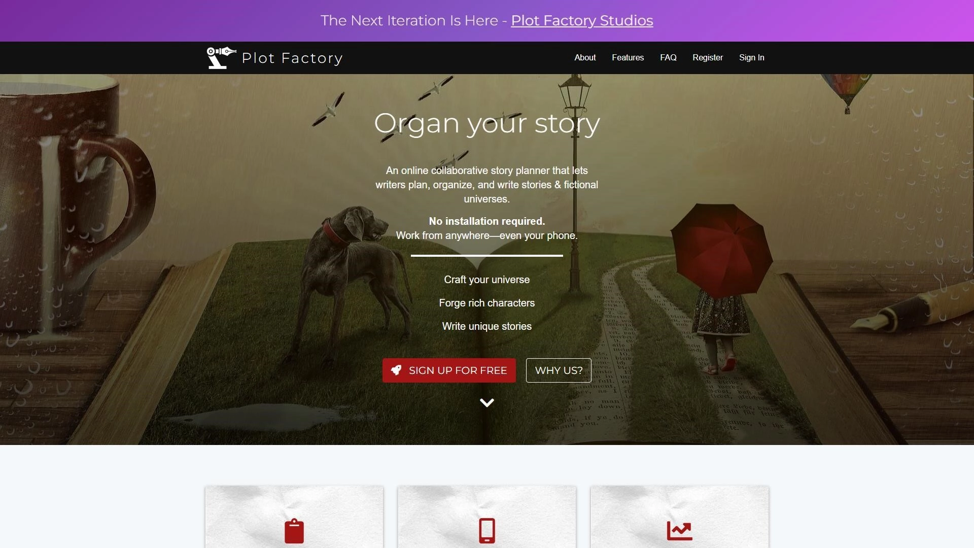 Plot Factory - онлайн платформа для авторов, которая объединяет планирование сюжета, прописывание вселенной и героев, сам процесс написания и прослушивание текста вслух в одном веб интерфейсе. Сервис работает в браузере и на смартфонах. И писать можно с любого места без установки дополнительного ПО. Пользователь создаёт истории, вселенные и мобов, связывает их между собой, ведёт заметки, использует шаблоны сюжетных линий и отслеживает структуру книги по главам и сценам.