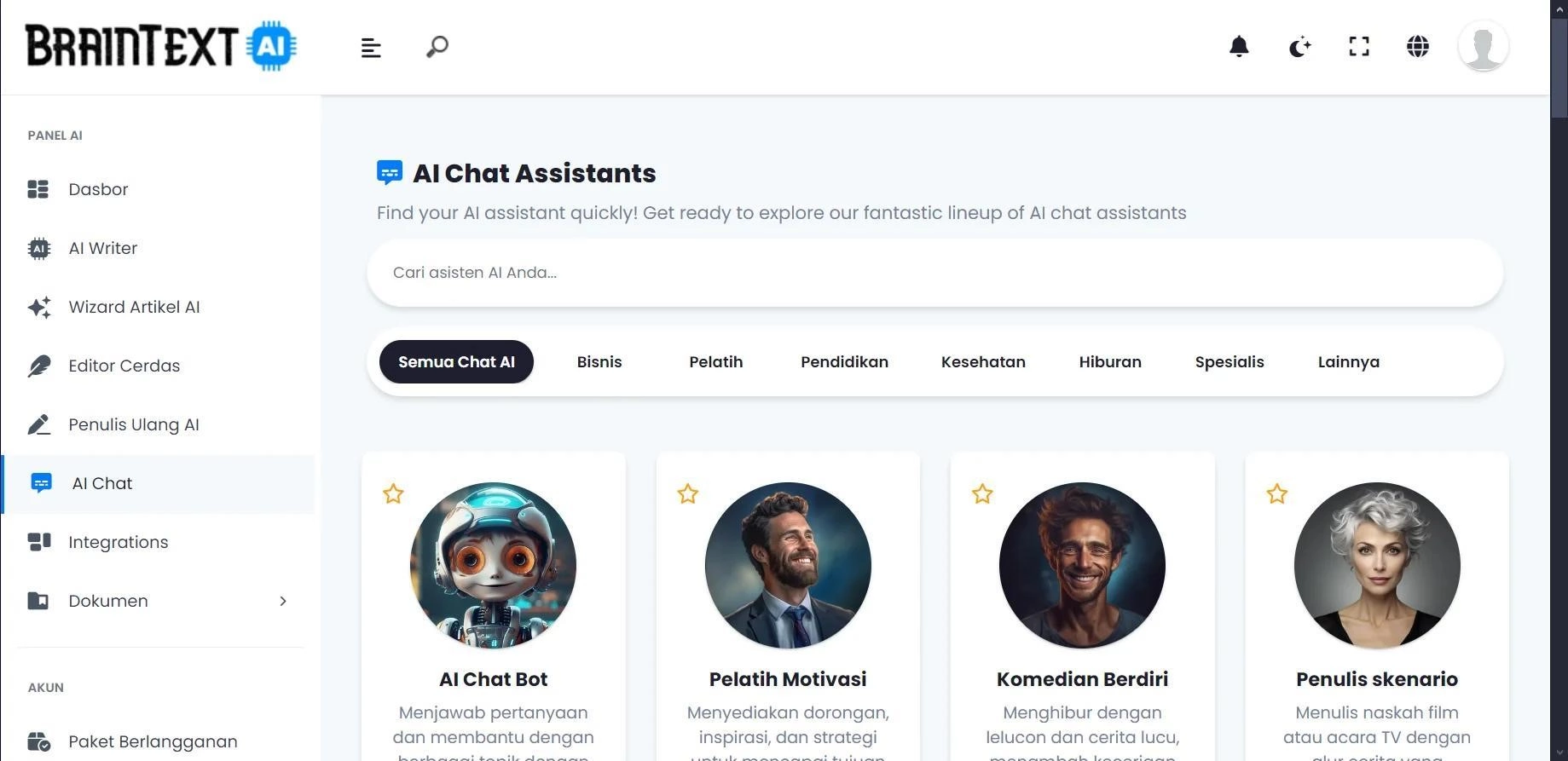 Помимо генерации текстов, BrainText AI даёт доступ к набору ИИ ботов с готовыми ролями и компетенциями. Виртуальные помощники, с которыми можно вести диалог в привычном формате чата.