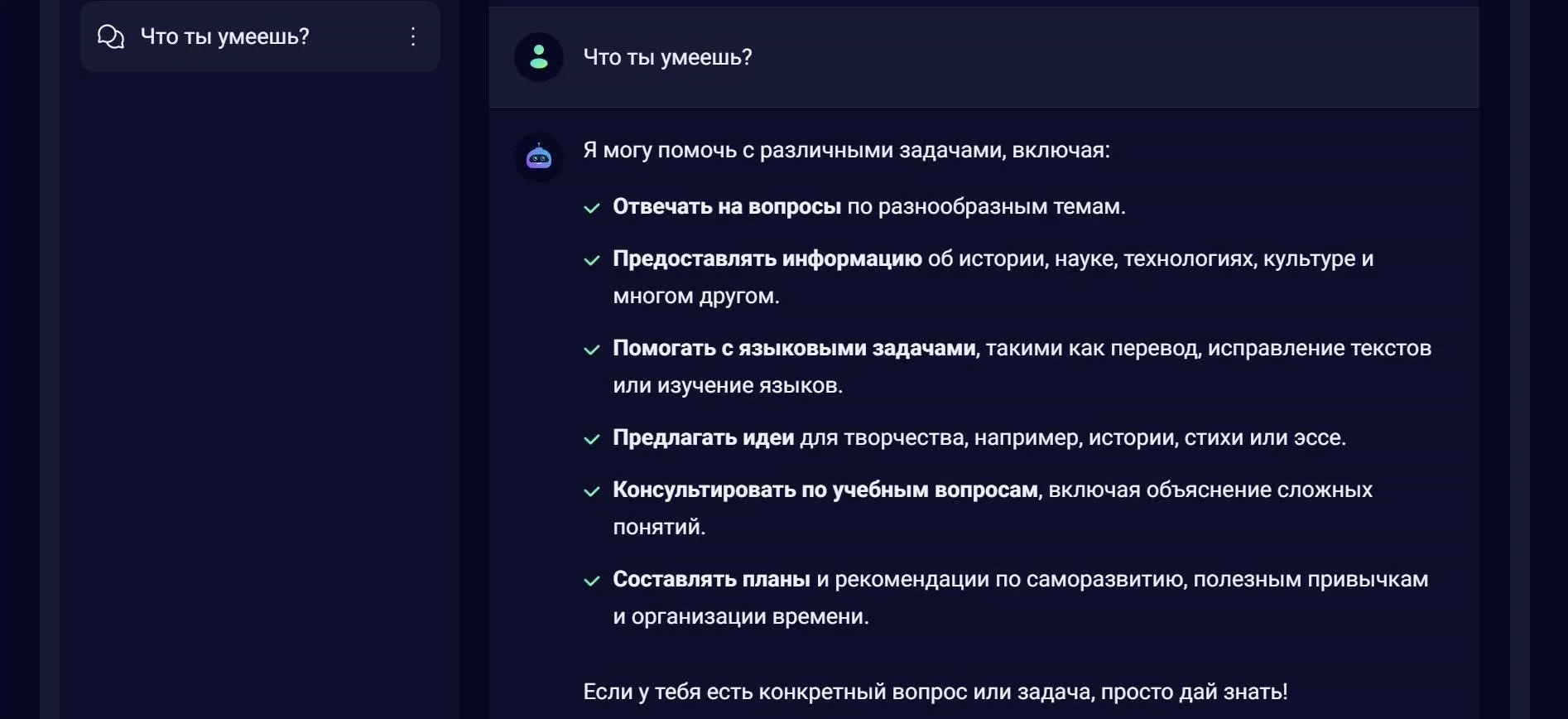 RuGPT можно использовать как чат бота, который отвечает на вопросы и поддерживает диалог. Вы задаете запрос обычным языком, а модель разблокирует варианты ответов. Она помогает написать письмо, пост, описание товара, конспект или небольшую статью. Для простых вопросов работает как справочник с развернутыми объяснениями.
