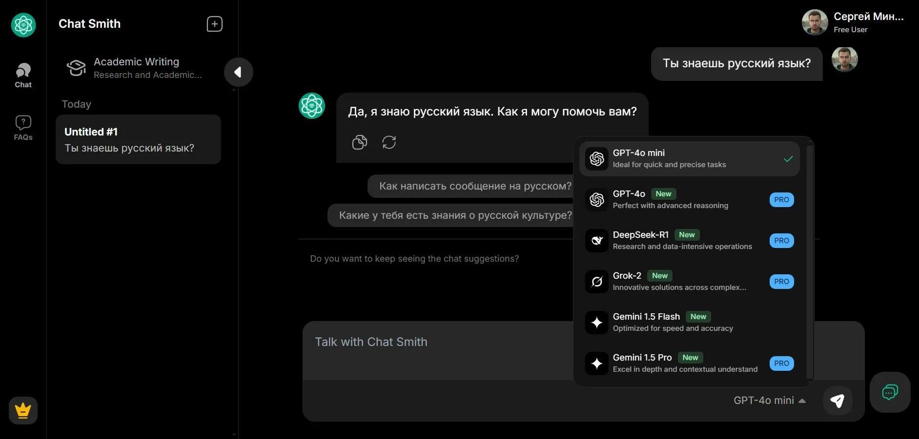 AI Chat Smith 4 работает по подписке с пробным периодом и поддерживает несколько языков интерфейса, включая русский. Делает его удобным для ежедневного использования.