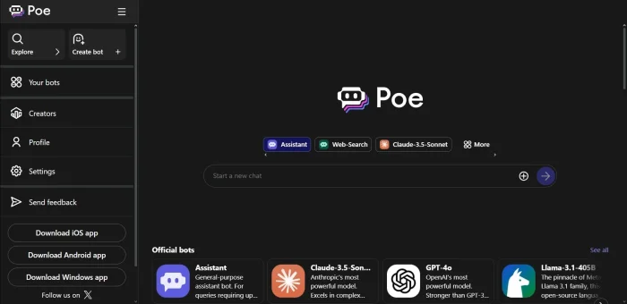 Нейросеть предоставляет единый центр доступа к моделям ChatGPT, Claude, Gemini, Llama, Stable Diffusion и другим инструментам, не требуя ручного переключения между сайтами и приложениями. Poe AI поддерживает текстовый диалог, генерацию изображений и работу с мультимедиа.